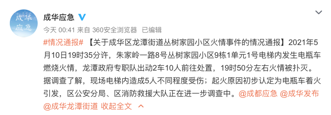 据成都市成华区应急管理局通报,火情在5月10日19时50分左右被扑灭。据调查了解,现场电梯内造成5人不同程度受伤,起火原因初步认定为电瓶车着火引发。