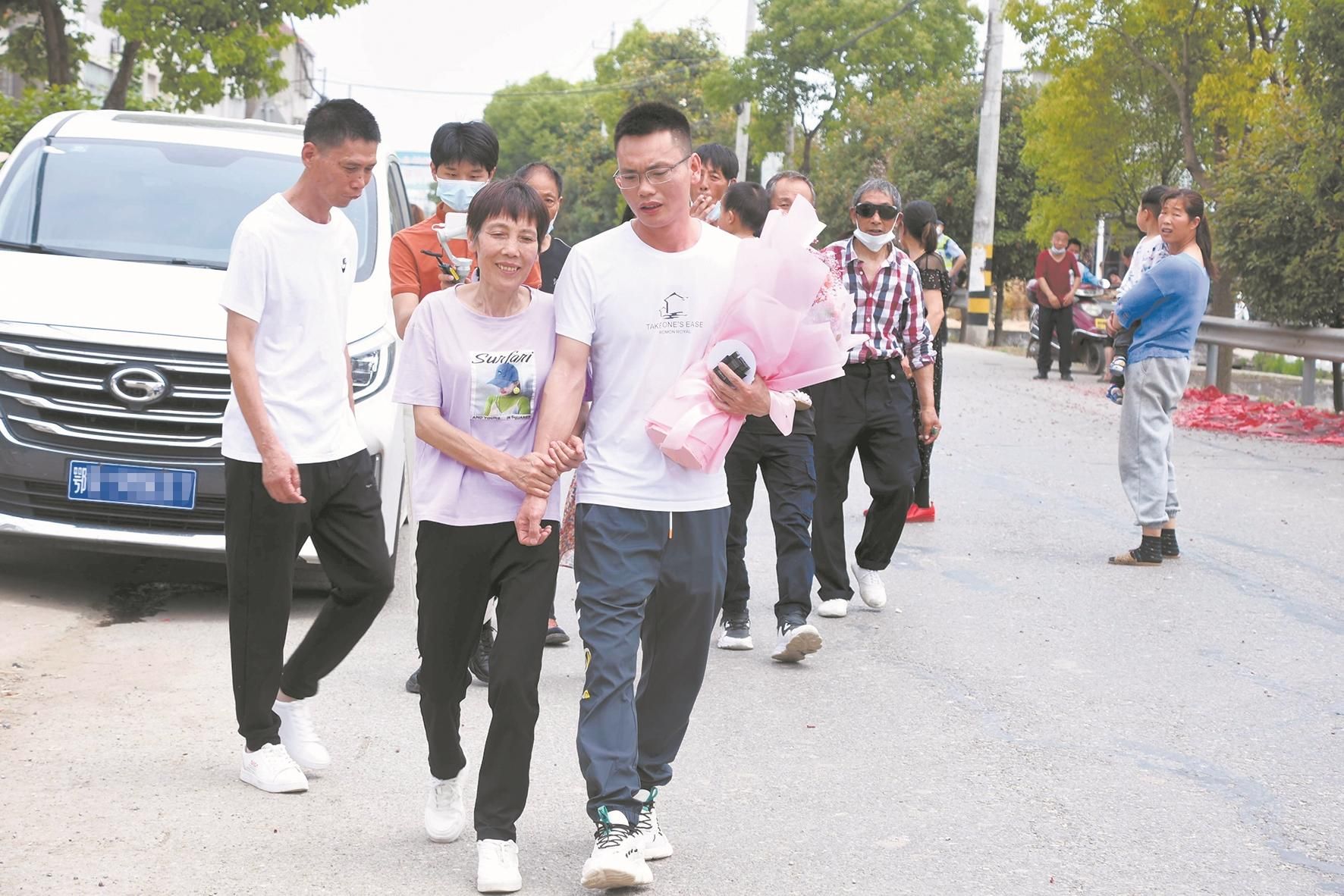 “来了,来了。”上午10时,在众人的欢呼声中,一辆白色轿车徐徐驶来。门拉开,一位年轻小伙子手捧鲜花直奔陈之彦而来。她再也控制不住,在丈夫的搀扶下迎上去,与孩子抱在一起掩面痛哭。