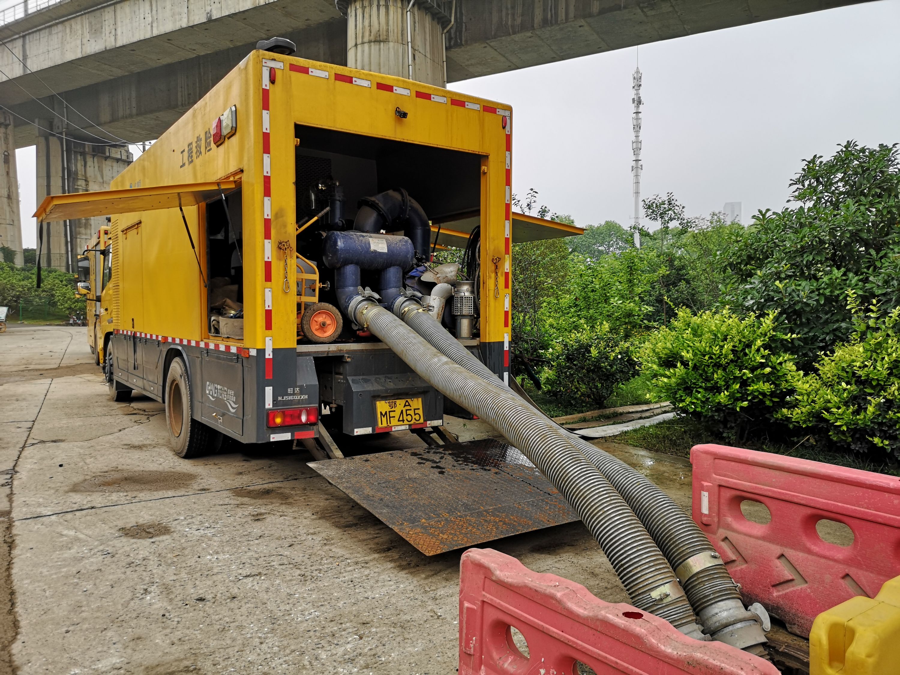 记者看见,食全氿美点位二号明渠旁停有2辆大型抽排泵车,2根抽水管已经插进了雨水井内,4根排水管也已经连到了二号明渠。只要一启动,一台泵车每小时可抽排约1400立方米的水。目前全区4个易渍水点位都已经提前安排抽排泵车和人员驻守,随时待命。