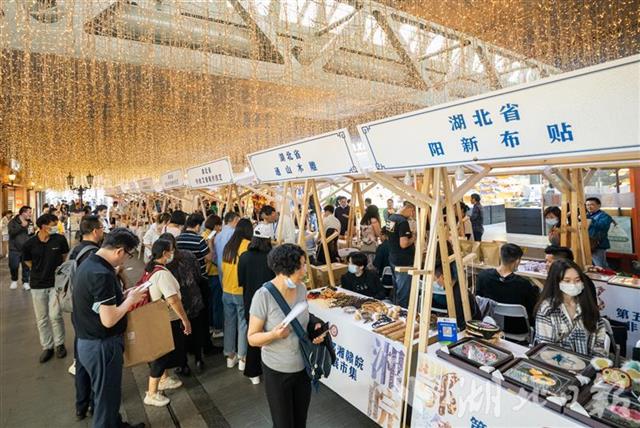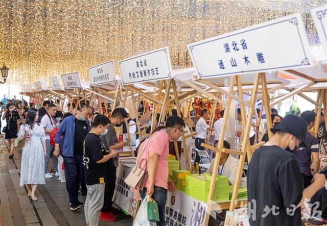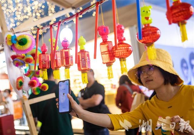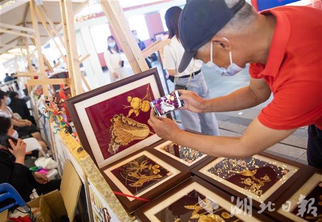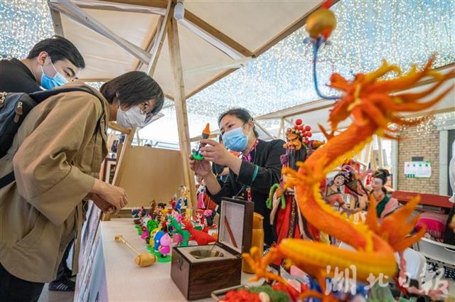 5月12日,市民在武汉楚河汉街非遗市集挑选非遗产品。当日,第五届鄂湘赣皖非遗联展市集在武汉楚河汉街举行。来自湖北、湖南、江西、安徽的84个非遗项目,几千件贴近民众日常生活的非遗产品吸引了众多游客。(湖北日报全媒记者 薛婷 通讯员 周锦婷 摄)