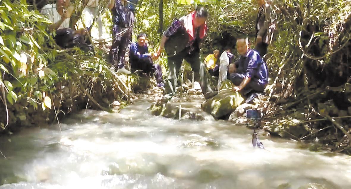 沿着崎岖的山路来到核桃坪村10组,茂密的树林里仅有一条下山小路,陡峭不平。步行一个多小时后,筋疲力尽之际眼前豁然开朗,平坦河岸边有清澈见底的小河,水中倒映青青草木,微风吹拂河水起皱,宛如一幅山水画。村里70岁的谭志芳老人大声说:“别看这条小河不起眼,水里有神奇的现象呢。”他来到河边,在一根树枝上绑上红布条做记号,然后插入水中,以此展示涌泉涨水奇观。