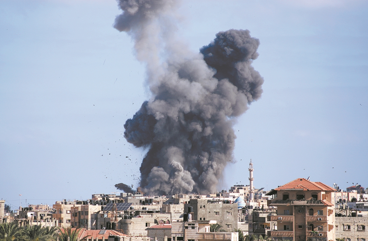 5月13日,加沙地带拉法的一栋建筑遭以军空袭后升起浓烟 新华社发
