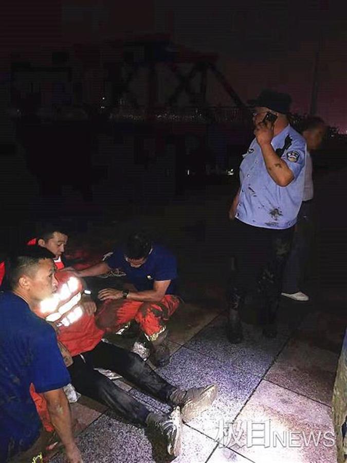 就在这时,前川消防救援站的消防指战员也赶到了现场。见状,消防员段伟也立即跳进水里帮忙救人。二人用救生圈拖住男子的上半身,固定好之后,推拉着救生圈朝岸边游去。夜里的视线太差,天空还飘着淅沥的小雨,救援并不容易,将落水男子救到岸边后,下水救援的二人早已精疲力尽。辅警陈波坐在一旁喘着粗气,全然不知膝盖和脚底已被划伤流血。