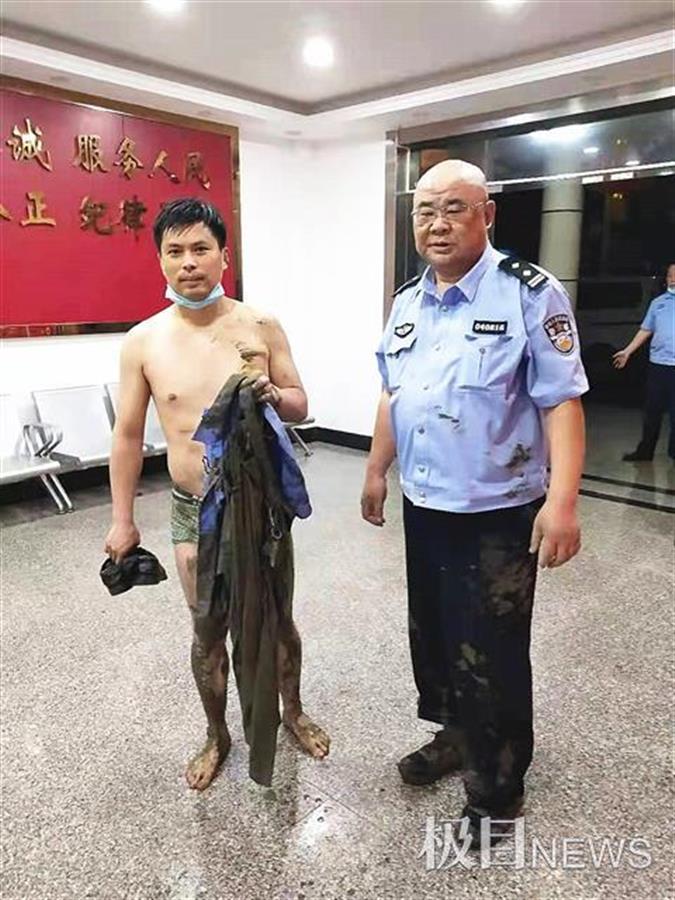 辅警陈波(左)一身淤泥