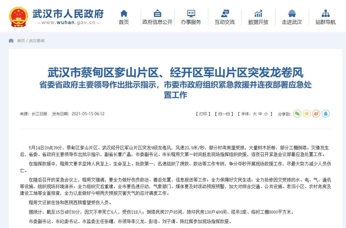 5月14日20点39分,蔡甸区奓山片区、武汉经开区军山片区突发9级龙卷风,风速23.9米/秒,部分村湾房屋受损,大量树木折断,部分工棚倒塌。灾情发生后,省委、省政府主要领导作出批示指示,副省长曹广晶,市委副书记、市长程用文第一时间赶赴现场指挥组织救援,连夜召开紧急会议部署应急处置工作。