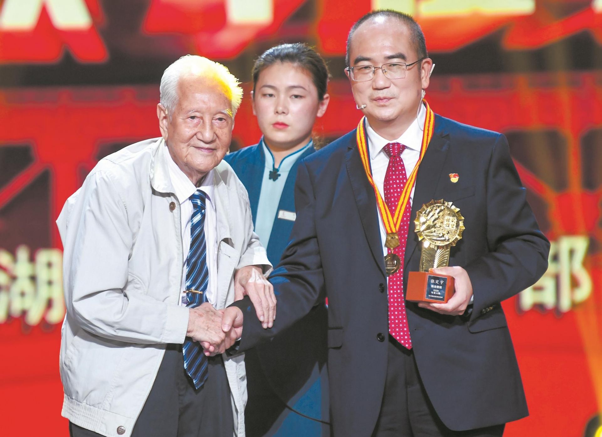无愧如山使命。英雄的城市,英雄的人民,面对2020年突如其来的新冠疫情,无数普通人挺身而出,倾尽所能,成为划破黑夜的一道光。瘴疠起,请长缨!华中科技大学同济医学院附属同济医院中法新城院区B12ICU救治团队,用生命托举生命;逆行返汉驰援火神山医院建设,骆名良用全部工钱及相关奖金购买物资捐献给医护人员,诠释着当代农民工的担当;连续奋战在抗疫一线100余天,王涯玲成为社区居民的健康守护者;从一人一车,到志愿团队,快递公司分部经理汪勇温暖了一座城市;背水一战,力挽狂澜,湖北省卫生健康委员会党组成员、副主任、公共卫生总师张定宇让无数人感动。“不要向我致敬,我要向所有人致敬!我的生命、荣誉不只属于我自己,而是属于湖北54万医护工作者,属于英雄的中国人民!”现场,张定宇深情地说。95岁高龄的共和国勋章获得者、全国道德模范、感动中国年度人物、中国第一代核潜艇总设计师黄旭华来到了现场,张定宇快步向前迎接。“能为你颁奖我感到很荣幸,你是祖国的骄傲、人民的英雄!”黄旭华说。