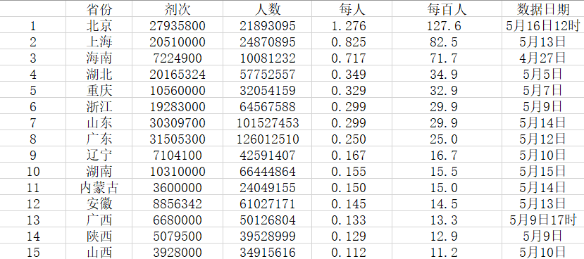 记者分析了4月底以来,公布最新疫苗接种情况的15个省、市、自治区的数据,上海以每百人82.5剂次位列第二。据上海卫健委主任邬惊雷介绍,截至本月13日,上海已经接种了新冠疫苗2051万剂。另一个每百人接种剂次超过50的地区是海南省,达71.7。海南新冠疫情防控工作新闻发布会4月27日发布的数据显示,该省累计接种新冠疫苗722.49万剂,接种人数达600万人。