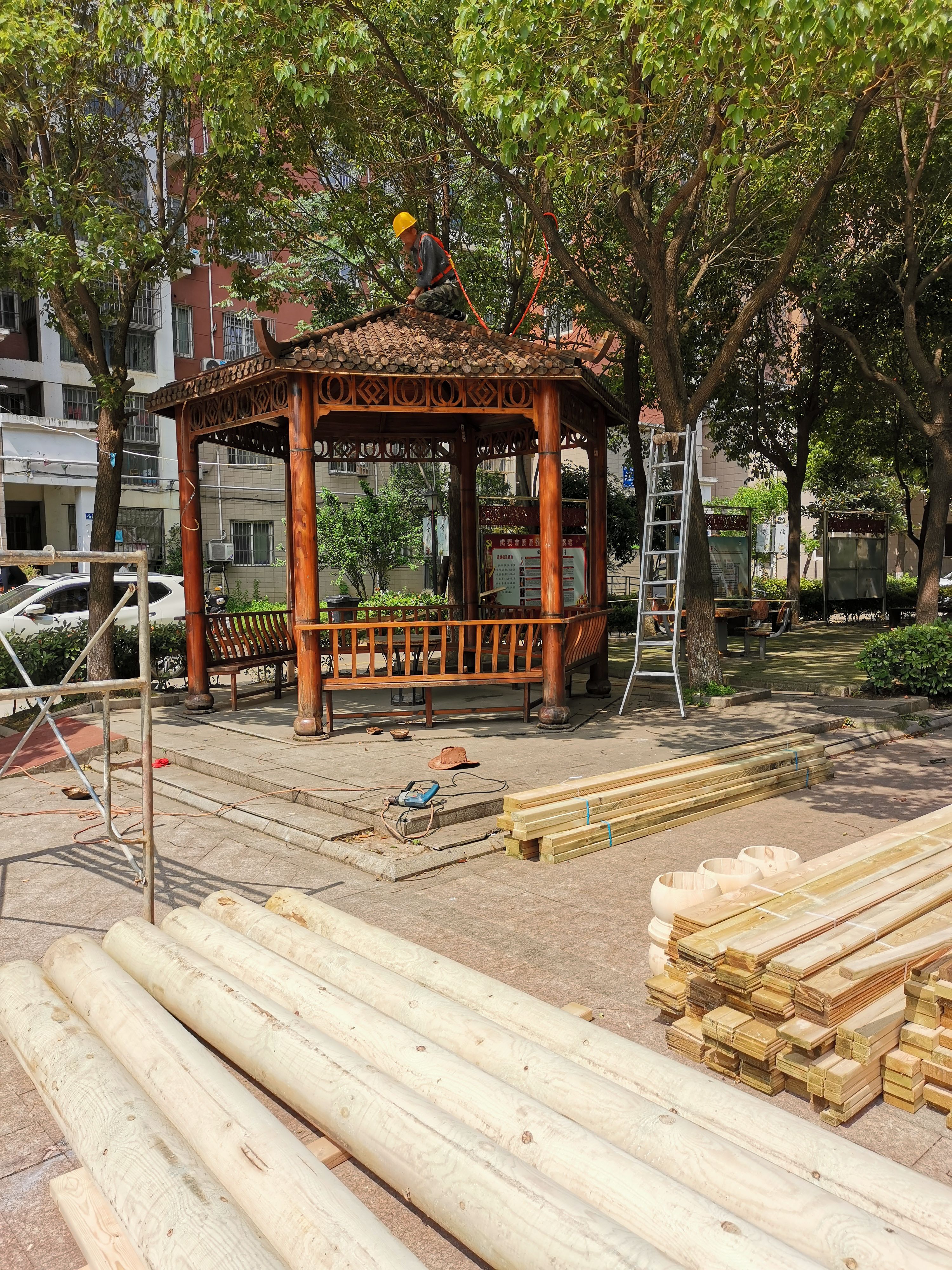 长江日报记者在现场看到,两座旧凉亭位于小区广场,其中一座凉亭破损情况严重,6个木质支柱底部均已朽烂,顶盖不少构件也已掉落;另一座凉亭的顶盖部分也破损较为严重。施工人员正在拆除情况最为严重的一座凉亭,周边重建所需的材料均已备齐。