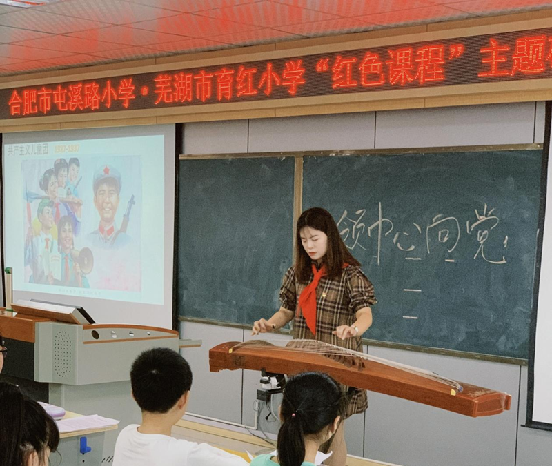 王鑫于通过对中国少年先锋队队史时间轴的梳理,以经典红色歌曲演奏、诗歌朗诵、党史故事串联、合唱队歌等方式,让学生直观地感受少先队组织成长的艰辛困难和不屈不挠。课中,王老师本人技法精湛的古筝演奏,直接拨动到了学生们的心灵深处,激发当代队员们为组织增光添彩的意识和动力,用满腔热血演奏了一首“慷慨激昂的进行曲”!