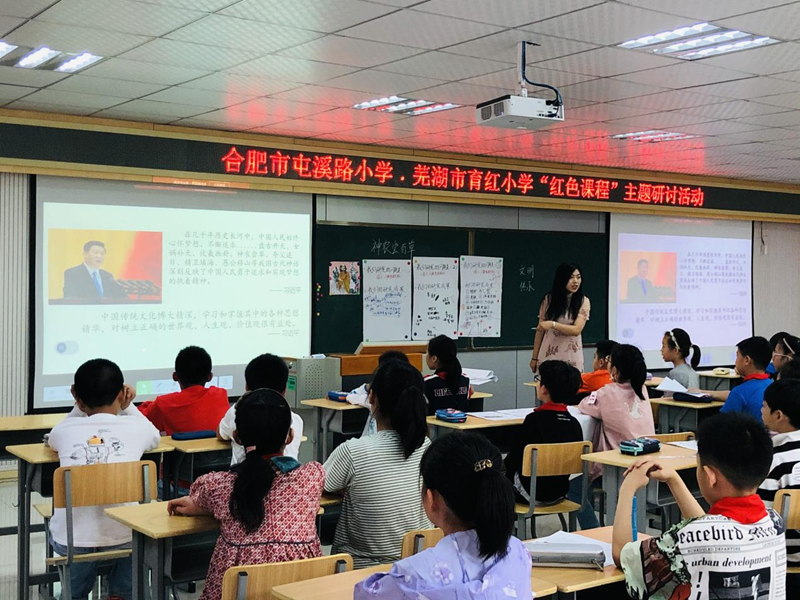 研讨交流环节,来自合肥市屯溪路小学的教师王鑫于、邢素萍分别执教思政课《红领巾心向党》、校本课《神农尝百草》,芜湖市育红小学李梦园、邹梦露两位老师分别执教美术课《学画农民画》与语文课《青山处处埋青骨》。