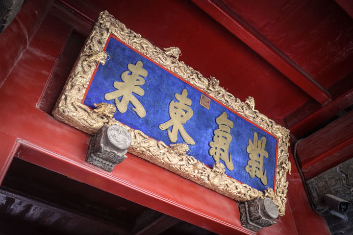 清金漆九龙紫气东来匾由清宫内务府制造,匾为木雕髹漆、镶铜字制成,匾外框浮雕云龙图案,九龙之首采用圆雕工艺,生动灵活;匾面刷洋蓝,其上镶铜板制成的大字“紫气东来”,文字中央上部镶朱文篆书“乾隆御笔之宝”印玺。