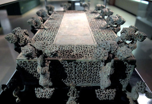 云纹铜禁于1978年淅川下寺楚墓出土。西周时期,颁布了中国历史上第一部禁酒令,并将盛放酒器的案子称为禁。云纹铜禁上端装饰有12个龙形兽,下端为12个虎形兽,采用失蜡法铸造而成。