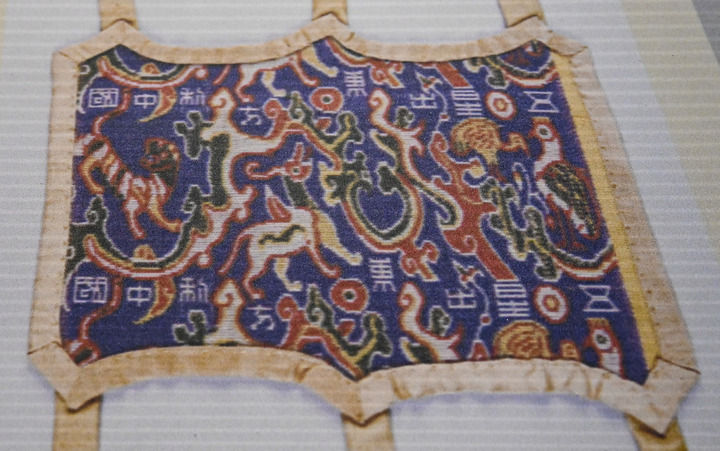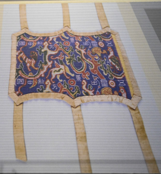 “五星出东方利中国”汉代锦护臂于1995年出土自新疆民丰县尼雅遗址,锦护臂呈长方形,长18.5厘米,宽16.5厘米。以红、黄、蓝、白、绿五色丝线织出云气纹以及祥禽瑞兽的图案。全国出土的锦护臂仅此一件,因此非常珍贵。