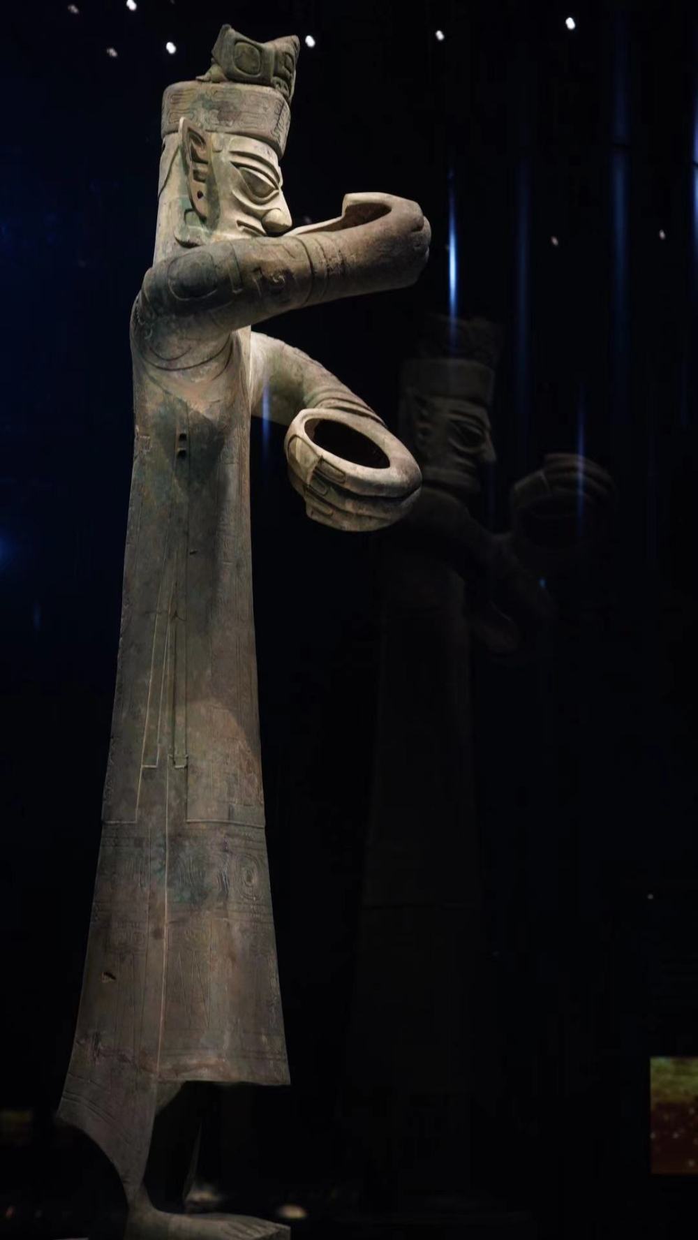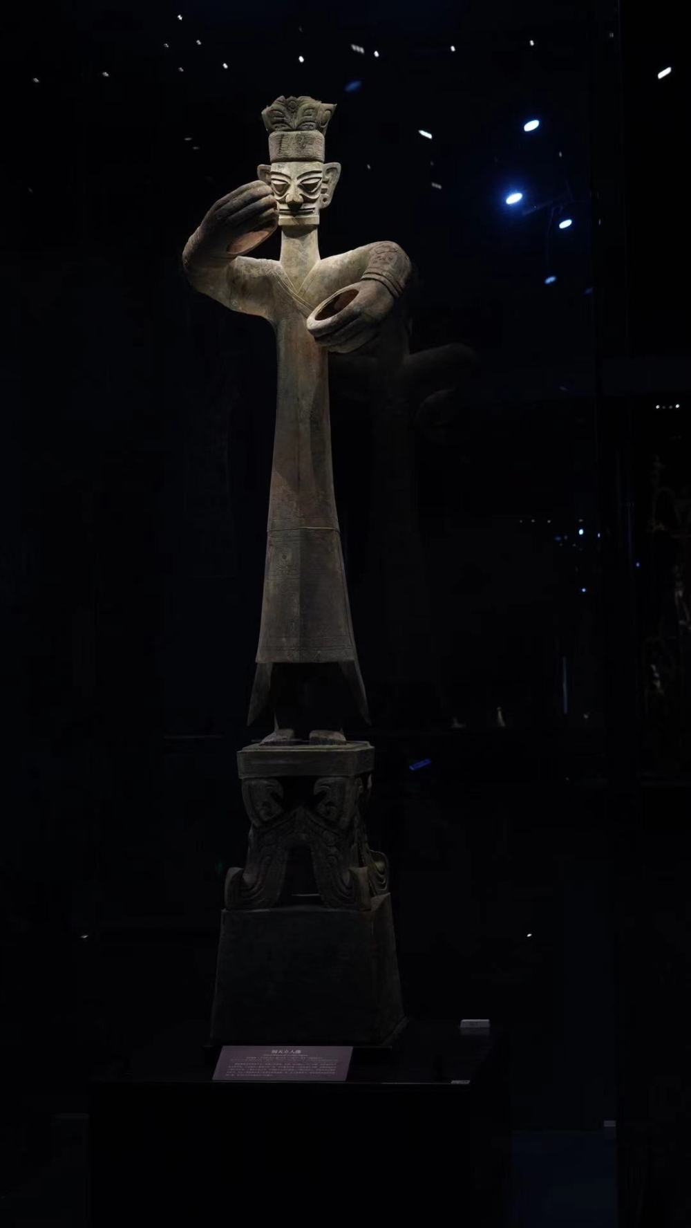 铜大立人像于1986年,在三星堆遗址2号祭祀坑所发现。铜像基本采用写实手法,按真人的高矮、比例、动作塑造,同时对眼、耳及双手作了较大的夸张,以此强化人像超凡的一面,似乎表现的是一个具有通天异赋、神威赫赫的大人物正在作法。