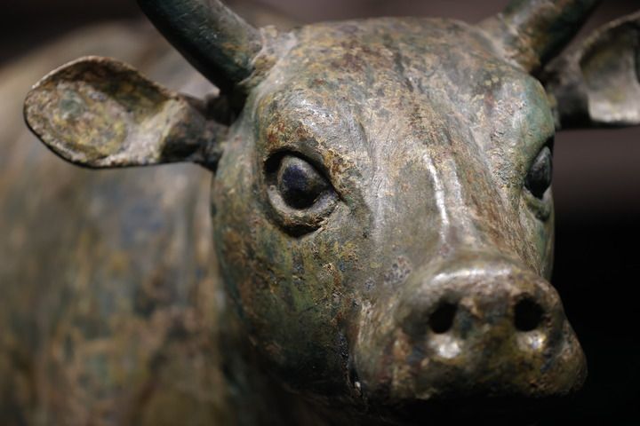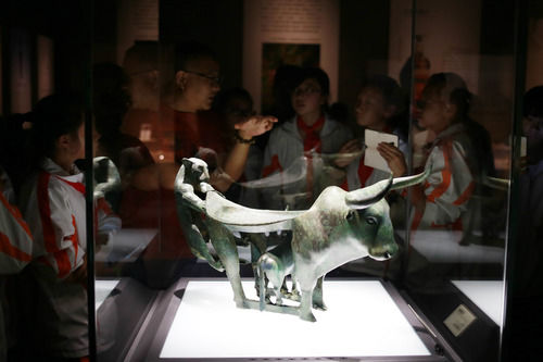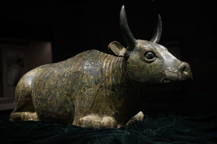 鎏金铜牛1977年出土于西夏陵第101号陪葬墓。整尊铜牛是由青铜浇铸而成,内部空心,外表鎏金,代表了西夏时期最为高超的青铜铸造工艺,真正达到了以形传神、神形兼备的最高境界。
