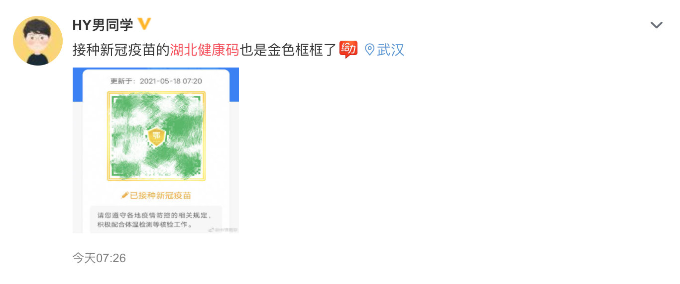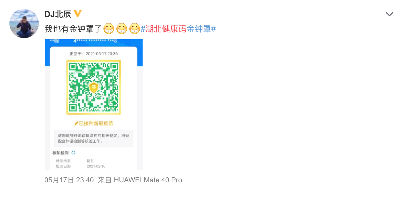 5月16日晚上,贵州省的健康码开始有金色的“甲秀楼”标志。日前,贵州健康码与疫苗接种情况对接成功后,贵州省疾控中心对健康码的显示进行了升级,现在不仅有新冠疫苗接种查询的条目,还增加了健康码上勋章显示。