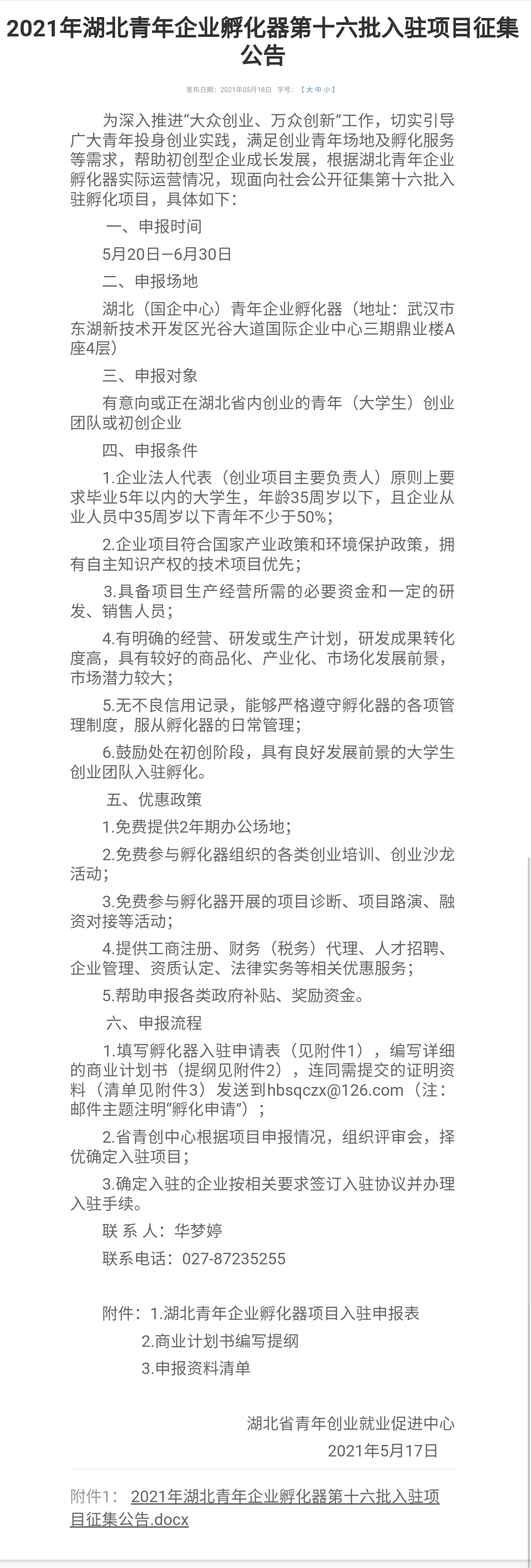 湖北日报讯(记者王婧、通讯员华梦婷)5月18日,记者从团省委获悉,湖北青年企业孵化器将开始征集第十六批入驻企业。申请成功的企业将获得2年期免费办公场地、免费投融资对接服务、免费参与孵化器组织的各类创业培训、创业沙龙活动,还可免费辅导申报各类政府补贴、奖励资金。