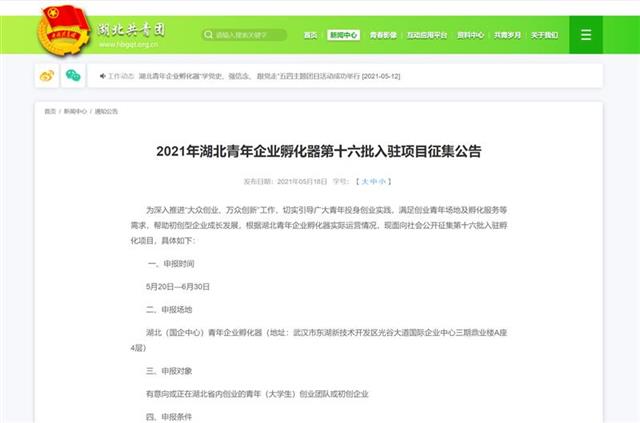 此次申报时间为5月20日至6月30日,申报场地为湖北(国企中心)青年企业孵化器(地址:武汉东湖新技术开发区光谷大道国际企业中心三期鼎业楼)。申报对象为有意向或正在湖北省内创业的青年(大学生)创业团队或初创企业。
