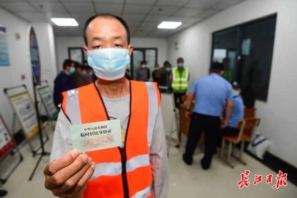 工人领到办好的临时身份证。