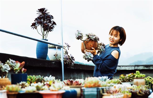 刘根妻子展示多年生多肉绿植。