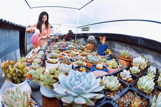 5月19日,在竹山县麻家渡镇营盘河村二组村民刘根的楼顶,600多盆造型各异的多肉绿植长势喜人。2016年,刘根和妻子从网络平台发现了多肉形态各异,能够美化居住环境,陆续购回种苗、盆具、肥料及养肉肉的教材,夫妻二人工作之余悉心钻研多肉移栽、扦插、繁殖、防暑、防冻等养护技巧,利用楼顶40平方米的空闲场地,从最初的十几盆发展到现在的800多盆,在打发空闲时光中,为平淡的小日子增添不少乐趣。