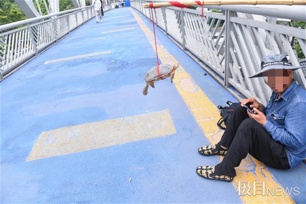 “有人在武昌中北路东湖西路天桥上,用竹竿吊着一只大乌龟,兜售乌龟,这样的场景以前我见过,现在又来了,是个老把戏!”5月18日,市民陈先生路遇身穿极目新闻工服的记者,积极报料。