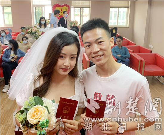 5月20日,武汉洪山区政务服务中心婚姻登记窗口迎来了结婚办证高峰。 通讯员供图