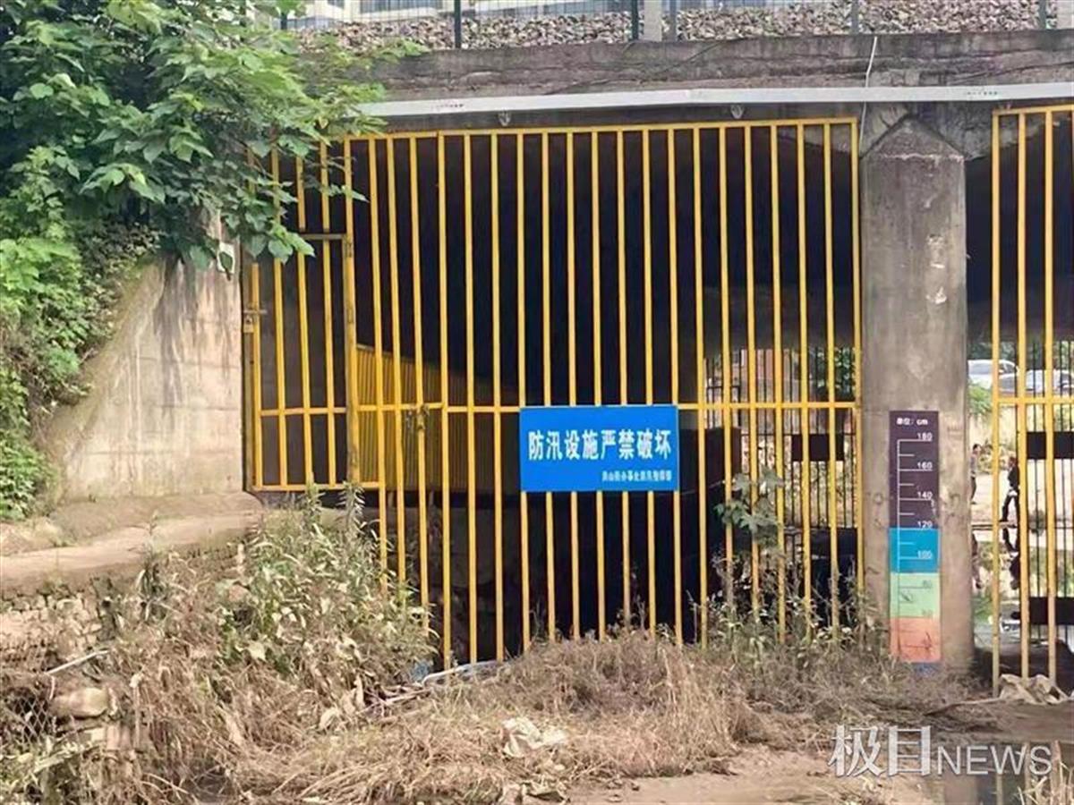 该涵洞临近地铁8号线,记者在现场看到,涵洞有10多米长,分为左右两股通道,路面上有积水,积水浅处可以看到堆积的淤泥和杂草。涵洞两侧,都被黄色的铁架子全部焊接,铁架子的中间,挂着写有“防汛设施严禁破坏”字样的提示牌,涵洞中间的柱子上,有一个积水深度提示标尺,通道靠近墙面有一道高约1.5米的小路。