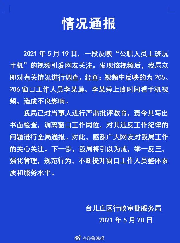 5月20日,据台儿庄区政务服务中心通报:2021年5月19日,一段反映“公职人员上班玩手机”的视频引发网友关注。发现该视频后,我局立即对有关情况进行调查。经查:视频中反映的为205、206窗口工作人员李某莲、李某婷上班时间看手机视频,造成不良影响。