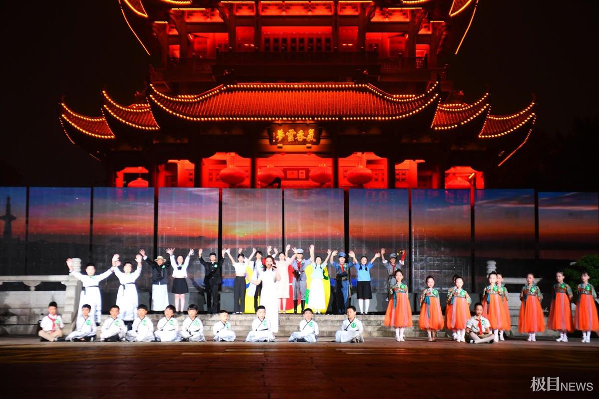 游客登临黄鹤楼主楼,360度欣赏武汉城市夜景,随后步行来到西广场的观影区,静候一场汉服巡游走秀与儿童国风宋词音乐剧。