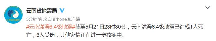 截至5月21日23时30分,云南漾濞6.4级地震已造成1人死亡,6人受伤,其他灾情正在进一步核实中。