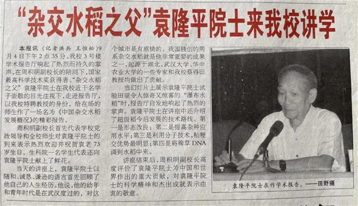 袁隆平院士在湖大讲学(图为2003年9月15日湖大校报报道)