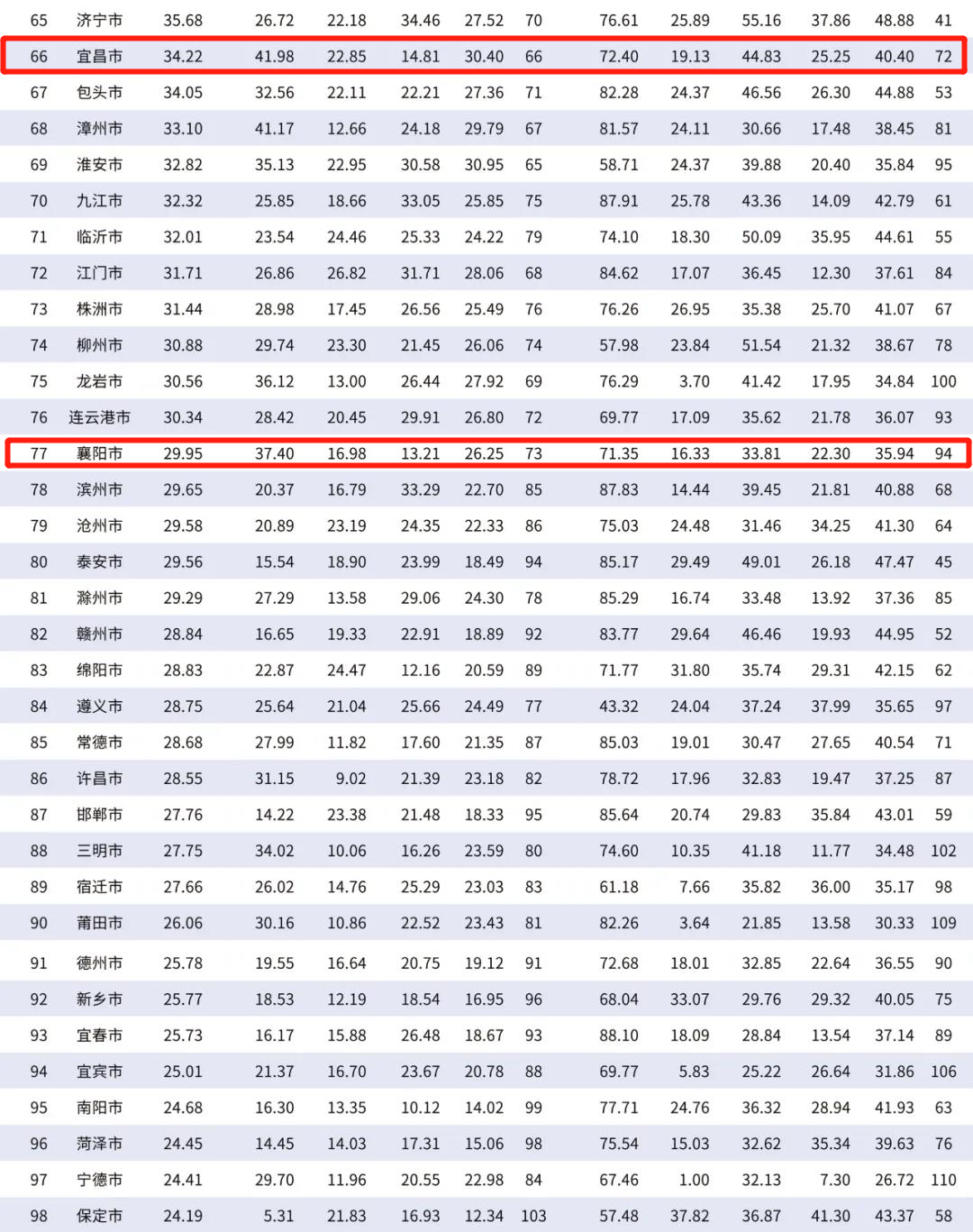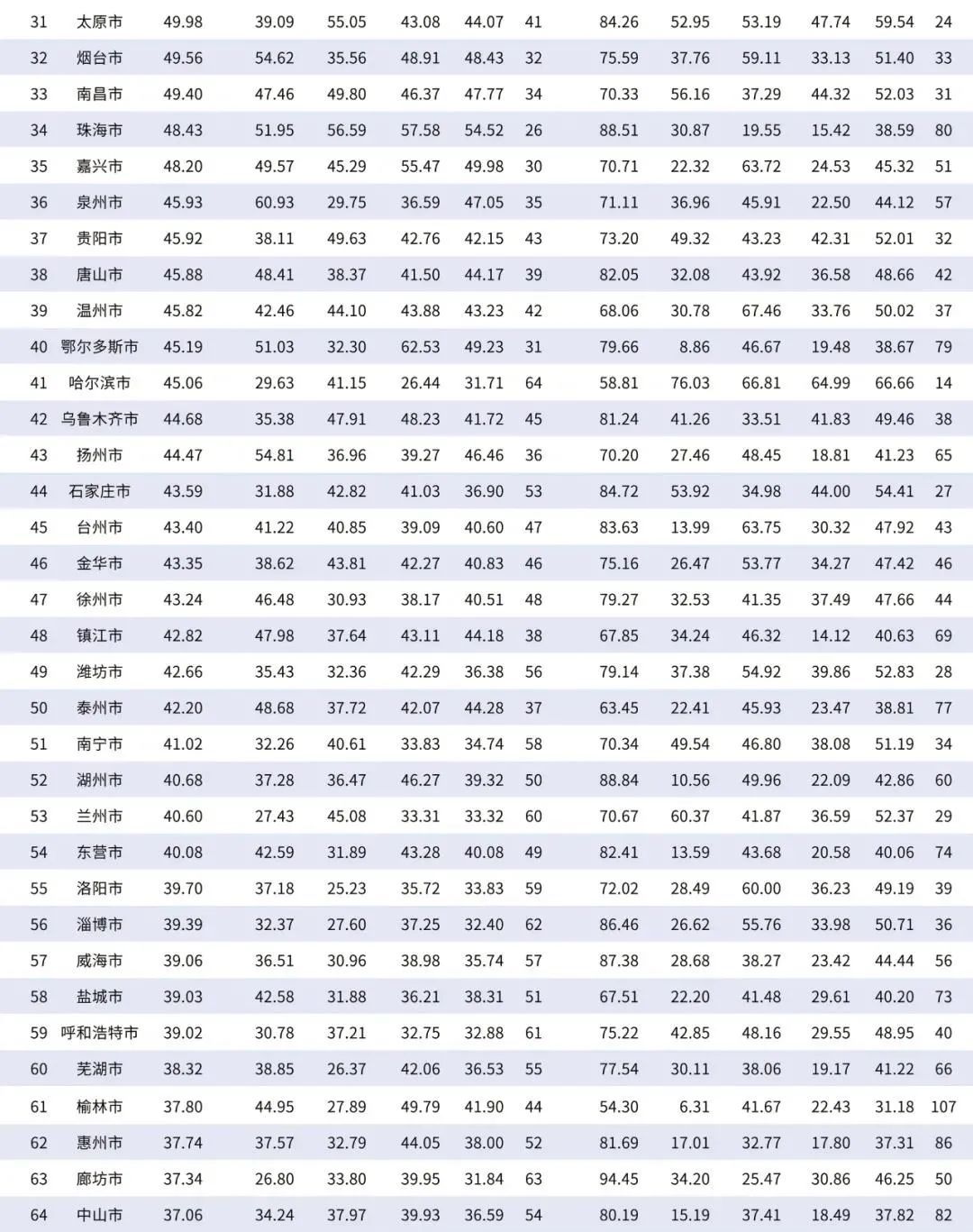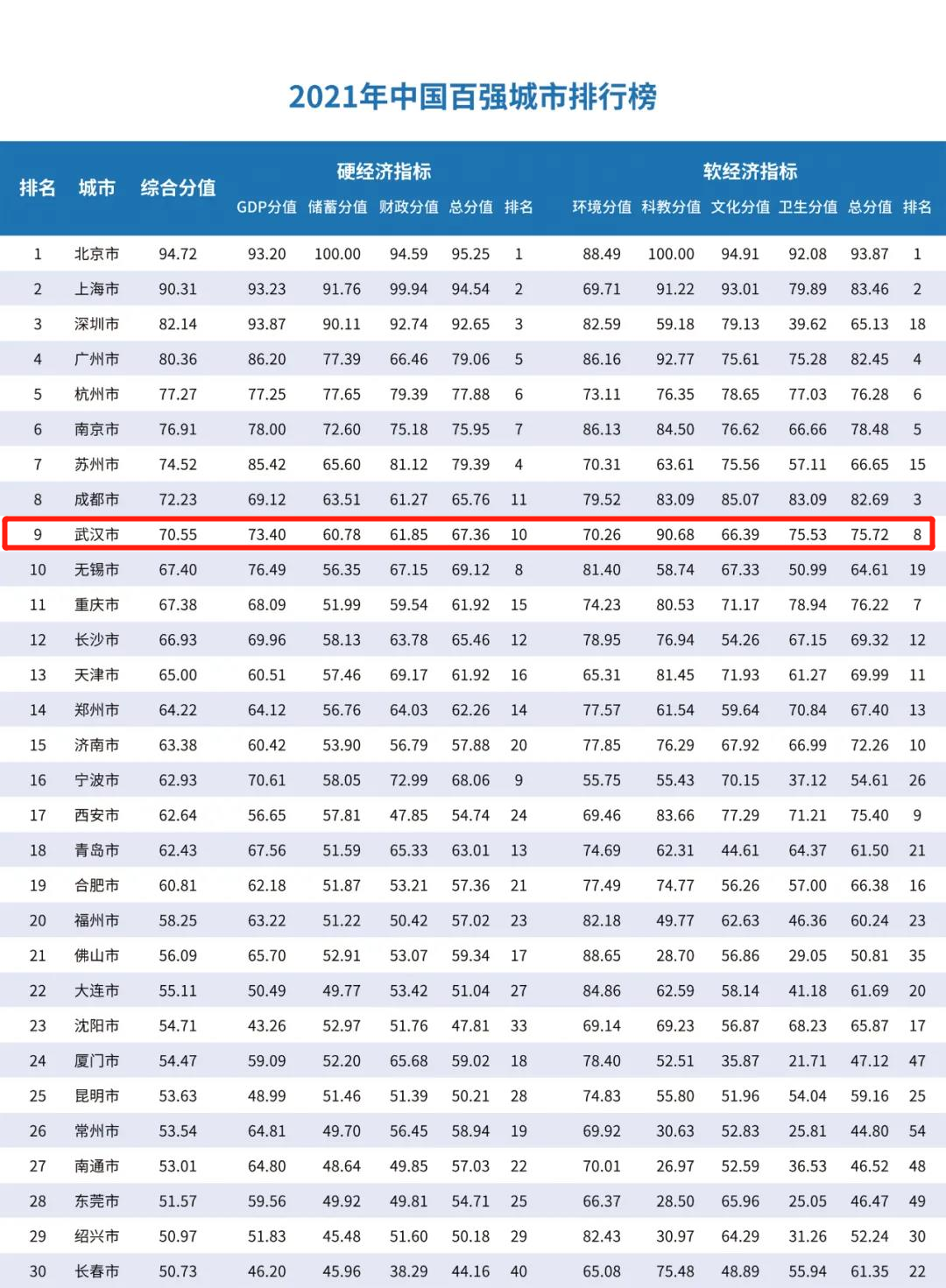 在“2021年中国百强城市排行榜”上,北京、上海高居前两位,综合分值分别为94.72和90.31。位居第三至第十位的依次是深圳(82.14)、广州(80.36)、杭州(77.27)、南京(76.91)、苏州(74.52)、成都(72.23)、武汉(70.55)和无锡(67.40)。今年滨州、宜宾和宁德三市新晋百强城市,焦作、大庆和湛江三市退出百强城市。