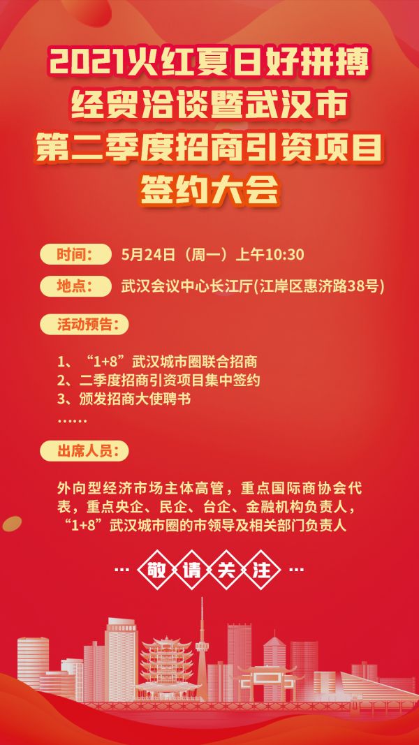 长江日报5月23日讯2021火红夏日好拼搏经贸洽谈暨武汉市第二季度招商引资项目签约大会将于5月24日举行。据悉,这是继3月24日“相约春天赏樱花经贸洽谈暨武汉市一季度招商引资项目签约大会”后,我市筹办的又一场大规模、高规格的经贸交流活动,也是我市招商引资满弓发力,全力以赴搏杀二季度的重要举措。