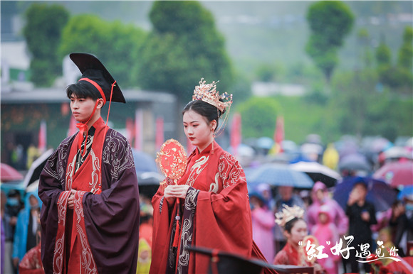 上午10时,龙缸景区人头攒动,虽然天空下着小雨,但丝毫不影响游客游览热情。在2021天下龙缸国际爱情文化节开幕式上,最引人瞩目的就是一场华丽的汉婚大典。