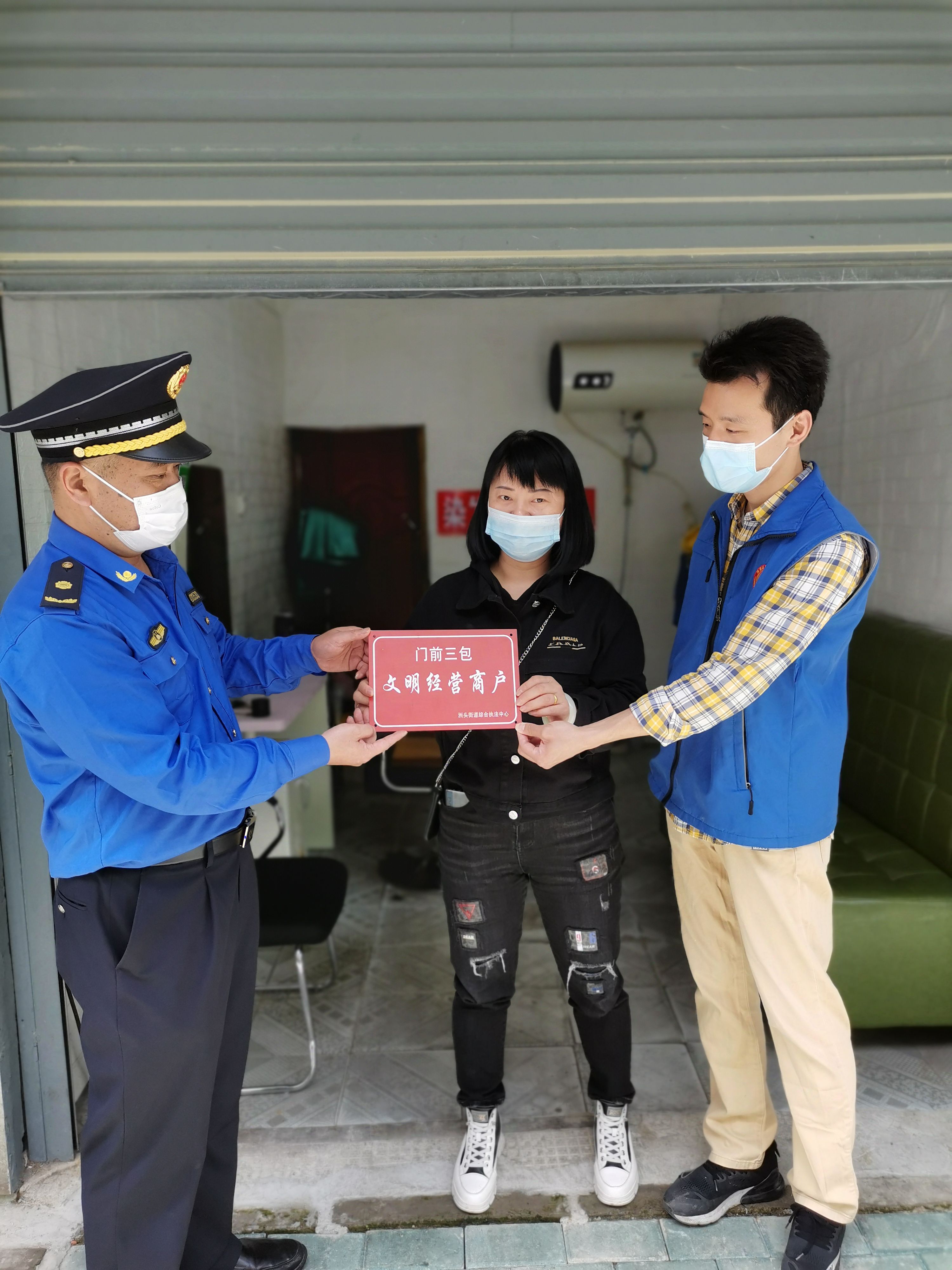 街道综合执法中心工作人员及社区书记、网格员一起,对5户门前三包文明经营户现场予以授牌表彰,同时也对5户“黄牌”商户进行了上门教育。