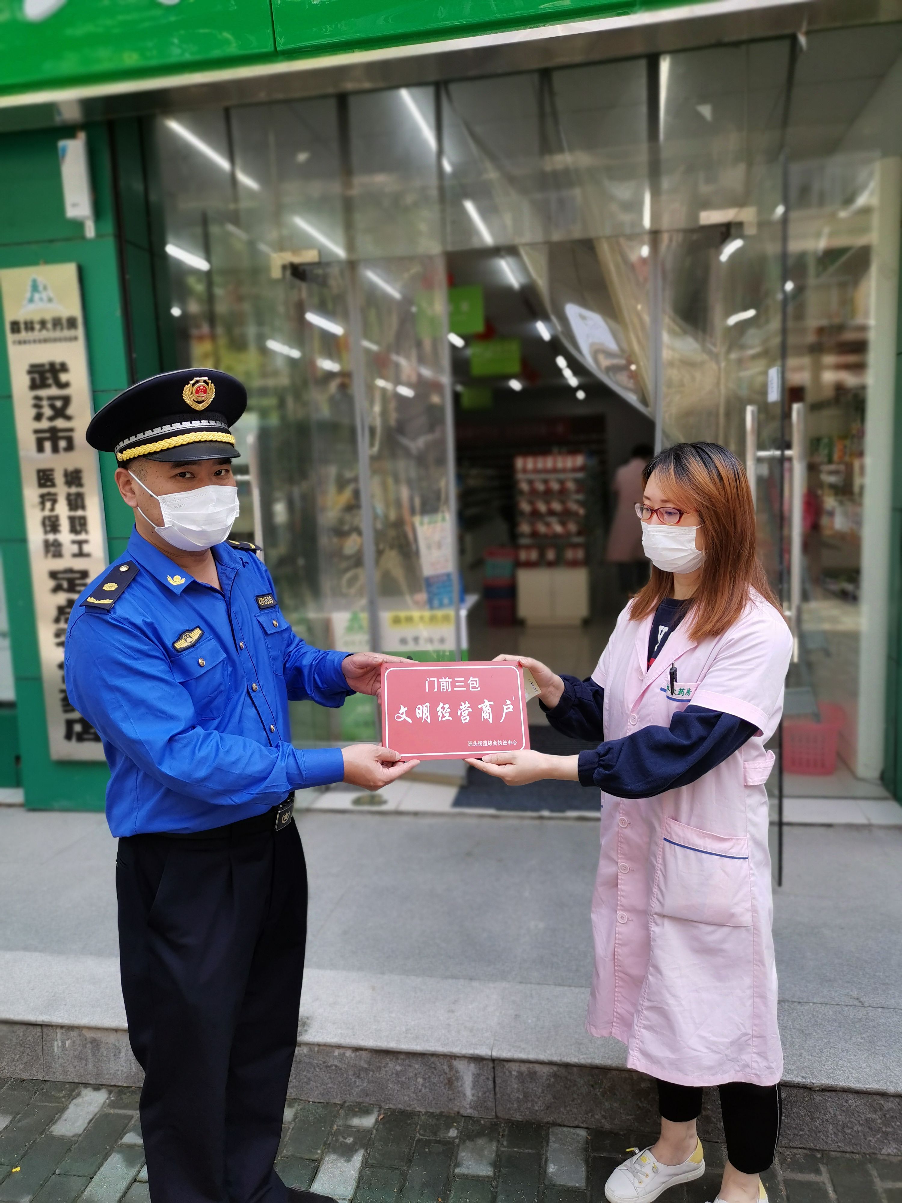 洲头街综合执法中心工作人员为“门前三包”文明经营户授牌。 长江日报记者史强 摄
