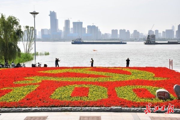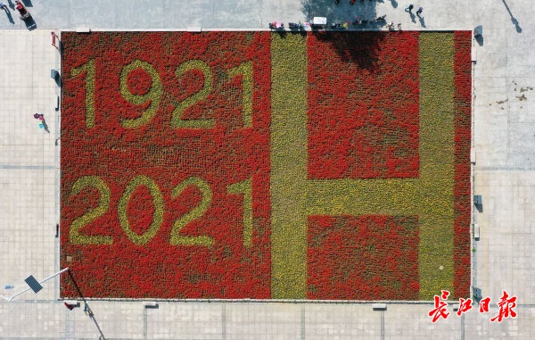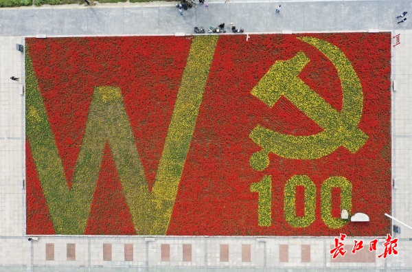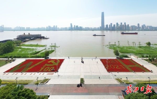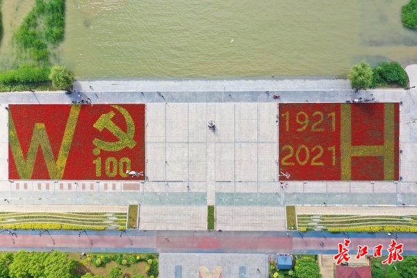 长江日报5月24日讯 24日,在汉口江滩三阳广场看到,这里用12万盆红色一串红和黄色孔雀草制作的巨幅鲜花景观,用“WH”字母代表武汉和中国共产党成立100周年的图案,成为汉口江滩新的景观。