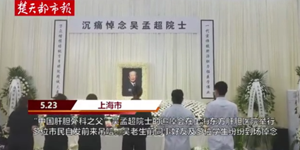 2、吴孟超灵堂放的是国际歌 23日,阴雨之下,“中国肝胆外科之父”吴孟超院士的追悼会在上海举行,多位市民自发冒雨前来吊唁。追悼会上,吴孟超院士的灵堂响起《国际歌》。曾经,别人不敢做的手术他做,有人说万一失败了对名誉不好,90多岁的吴院士却说:“我名誉算什么?救治病人是我的天职。”(@楚天都市报极目新闻)