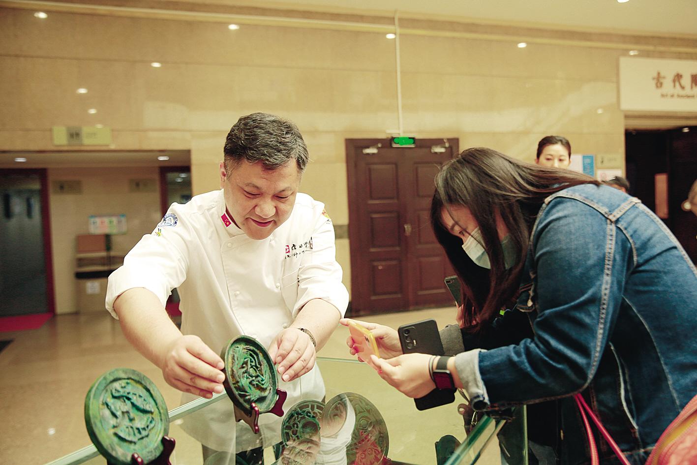 精雕细琢的龙首构件、梅瓶图饰、兽首衔环,巧克力、翻糖这些常见食材经“楚糖”团队精心演绎,呈现出或如木似铜、或如瓷似绢般的质感。现场观众仔细观摩,生怕错过每一个细节。几位将信将疑的小朋友冲上前,找常福曾索要边料品尝后开心地宣告,“真的是巧克力呢!”部分尝鲜的观众兴奋地拿着甜甜的“国宝”去展厅寻找文物“本尊”,通过舌尖感受文化遗产的魅力。