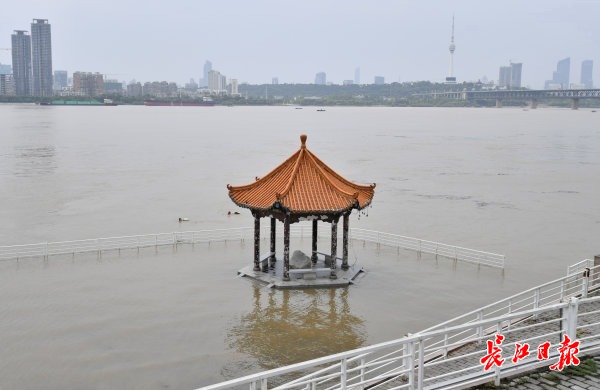 25日,武昌黄花矶,江水漫上观景平台,水位已经没过了凉亭的基座。长江日报记者喻志勇 摄