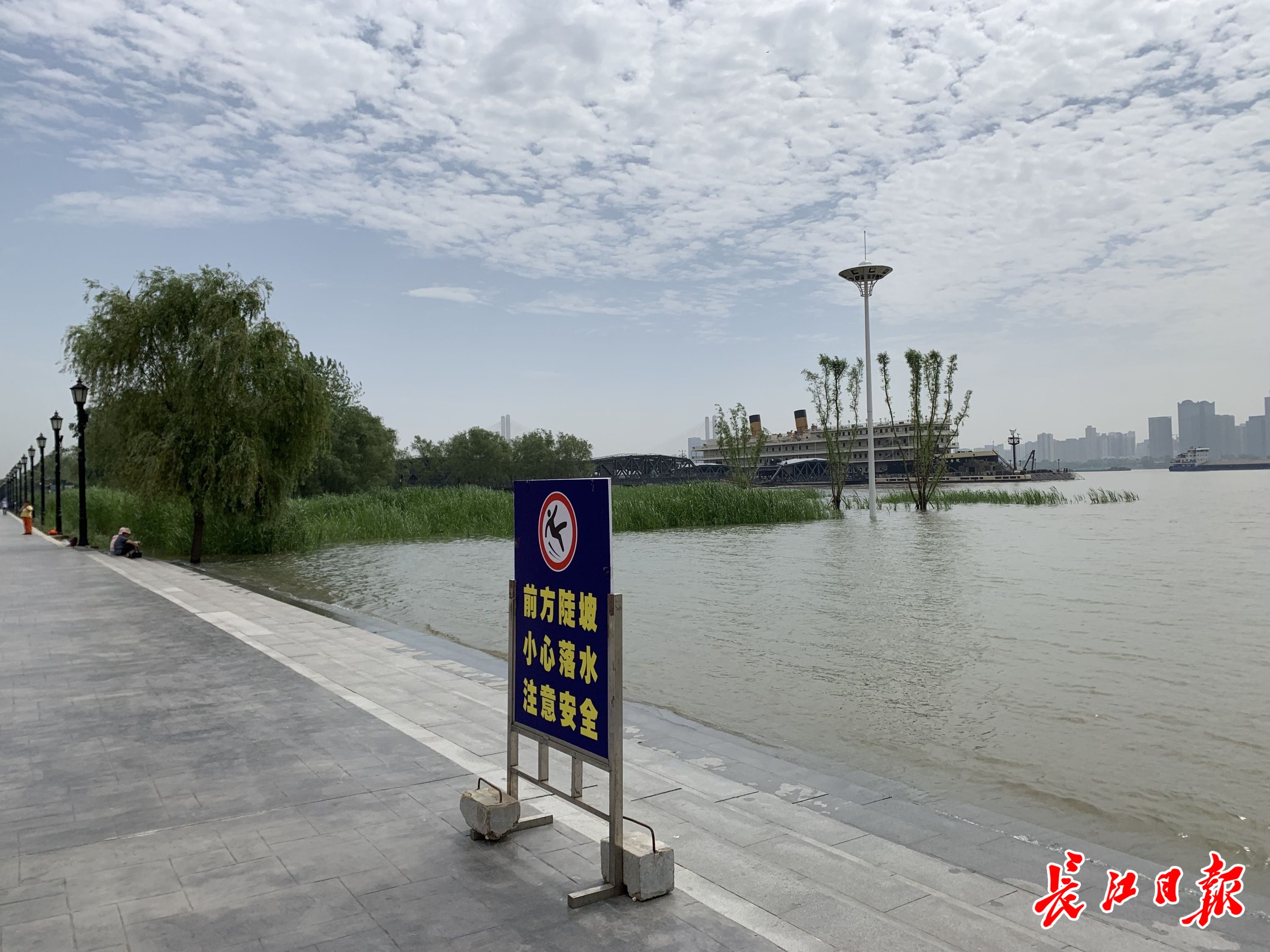 25日,汉口江滩江滩芦苇已经被淹过大半,市江滩办已在平台立上警示牌,提醒市民游客注意安全。 记者王怡人 摄