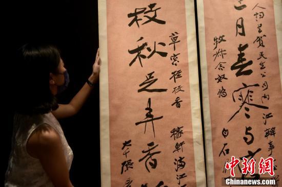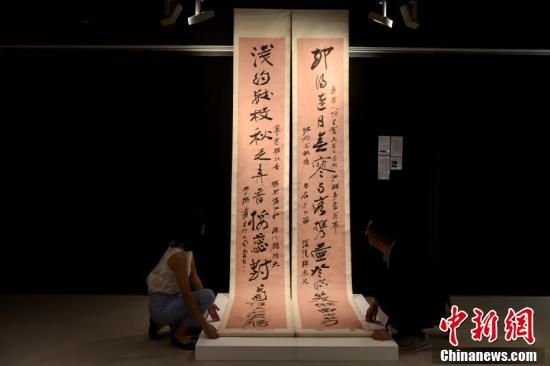 图为现场人员整理张大千的《行书十七言联》作品。 中新社记者 李志华 摄