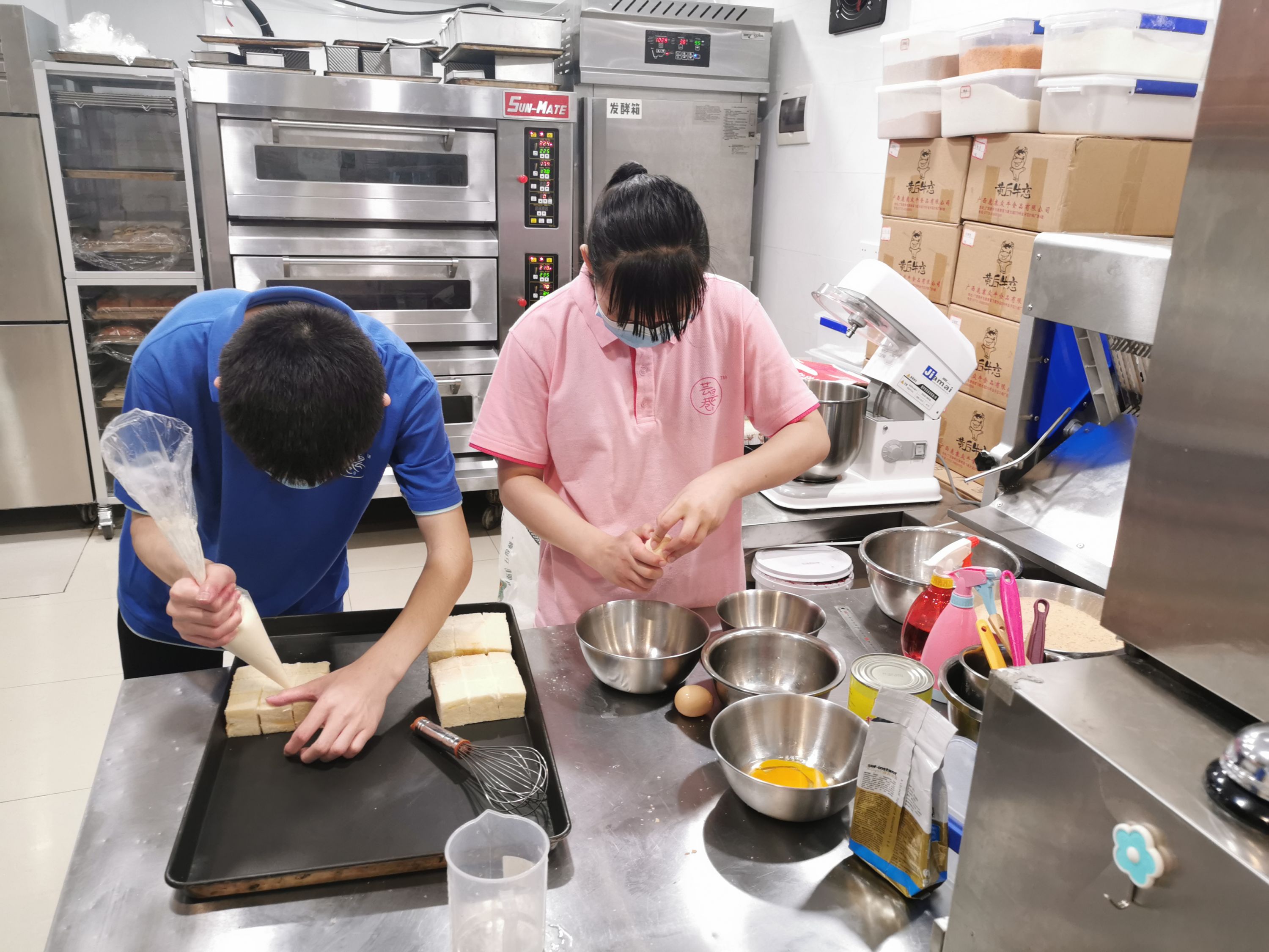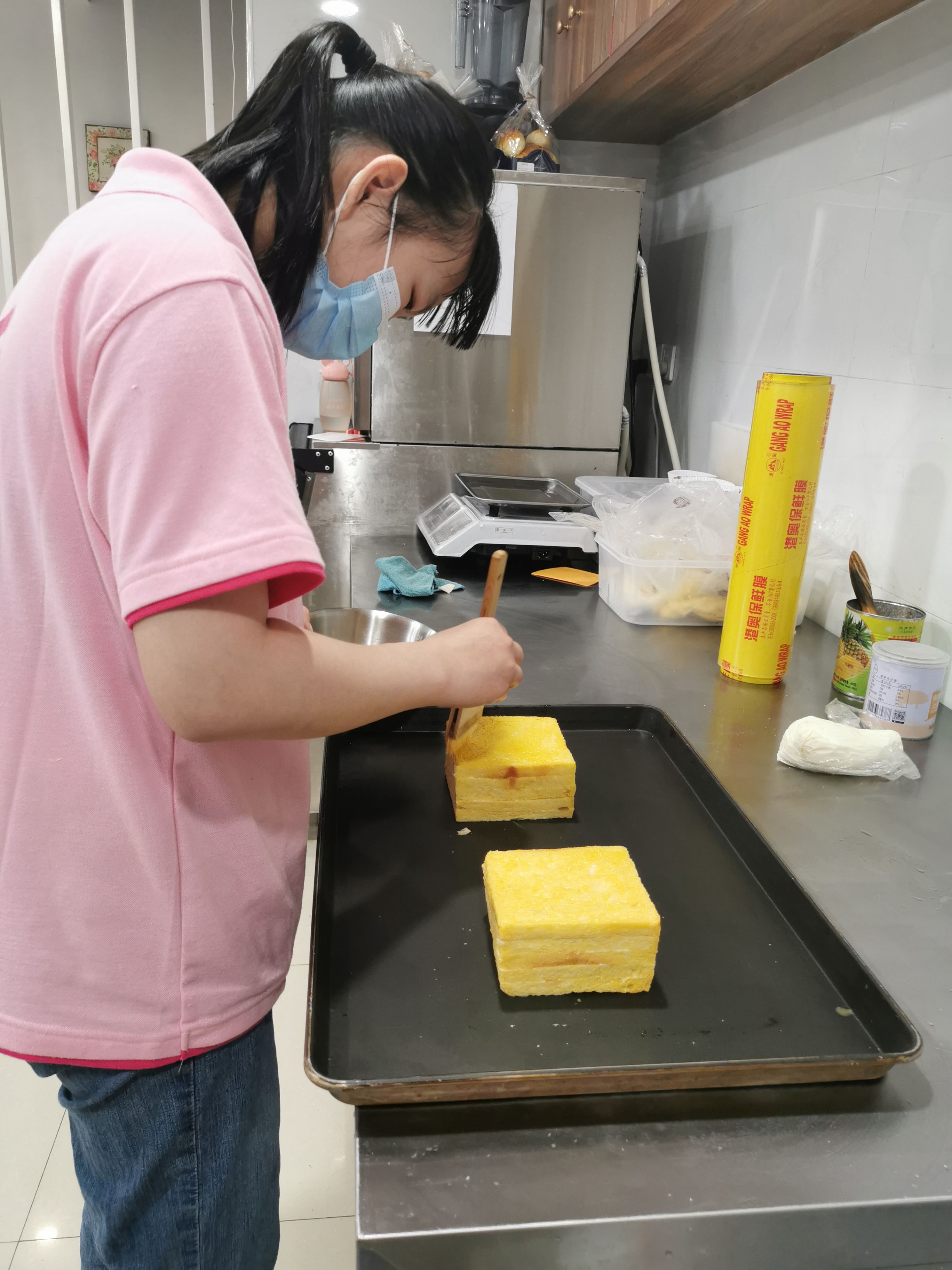 与蔡金灵一行“家人”告别后,阿娟回到店里继续工作。记者看到,她打好鸡蛋,将蛋清滤出,搅拌蛋黄,再用刷子均匀涂抹在面包上。在店里当学徒两周,阿娟适应得不错。每天跟着师傅学做蛋糕,她感觉充实而开心。