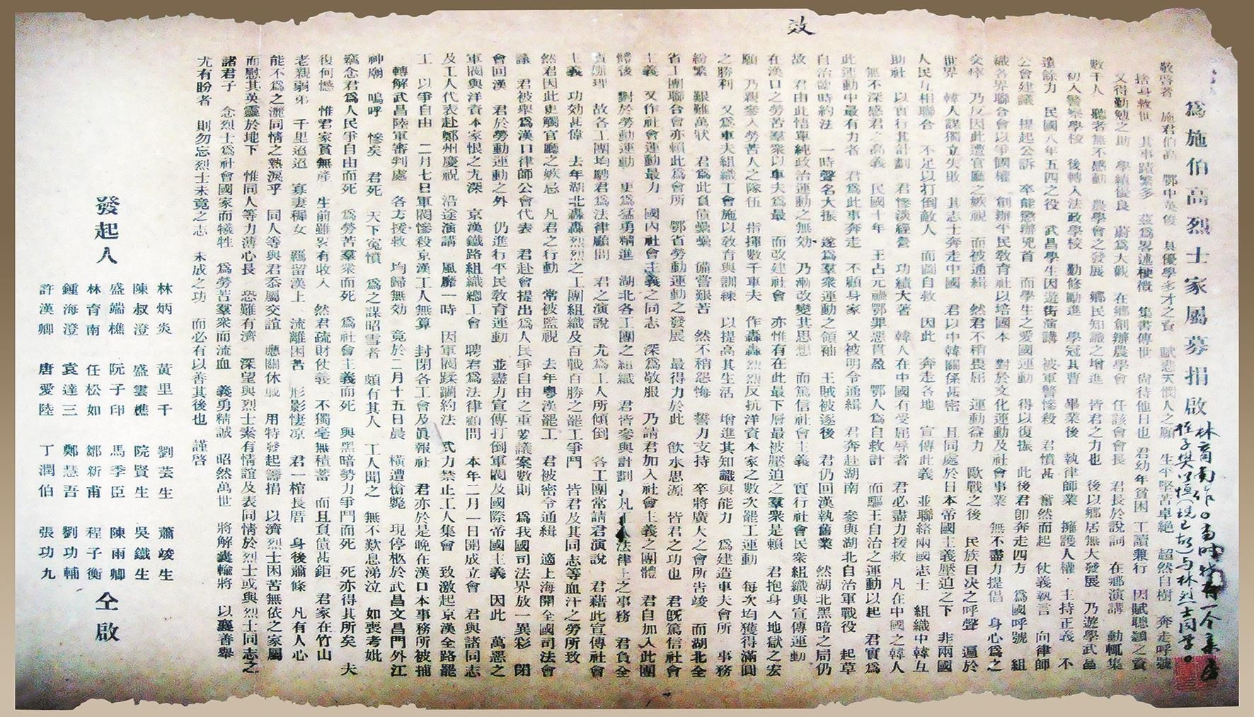 在武汉图书馆老馆员、武汉地方史志专家徐明庭的解释下,《为施伯高烈士家属募捐启》拨开了历史的迷雾。杜宏英这才了解到,原来“施伯高”就是施洋,这封“募捐启”,是施洋就义之后,他的同道们为了救助烈士遗属,告慰烈士生灵而撰写并印刷的。