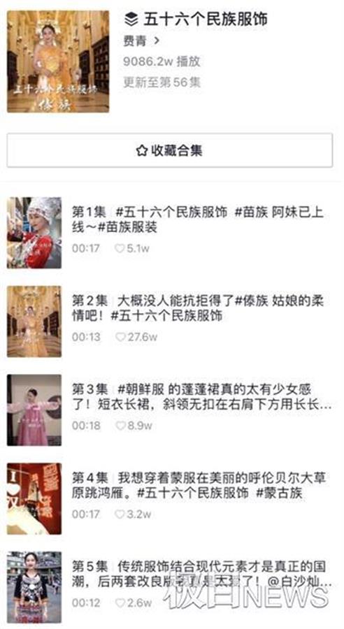 费青是抖音上一名粉丝超过40万的视频创作者。去年8月,她开始在抖音上发布民族服饰视频。第一期发布的是苗族服饰,当时就获得了超过5.2万点赞。随后,她带领大家相继领略了傣族、朝鲜族、蒙古族、满族等56个不同民族的服饰魅力,通过每周1-2条的更新频率,最终耗时247天,完成了全部拍摄。目前,这套合集视频在抖音上的播放量已经超过9000万。