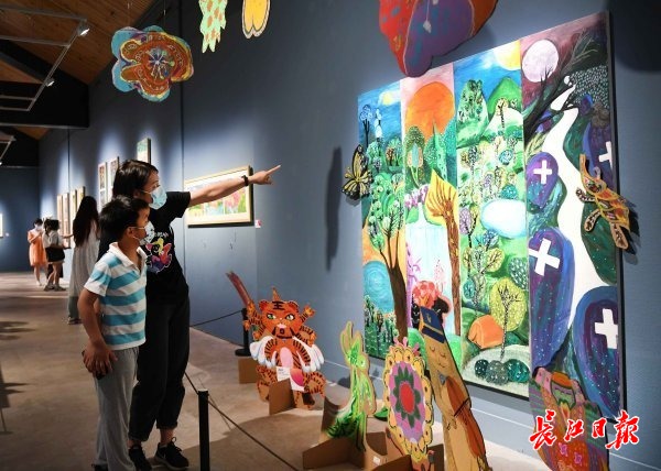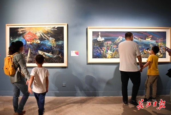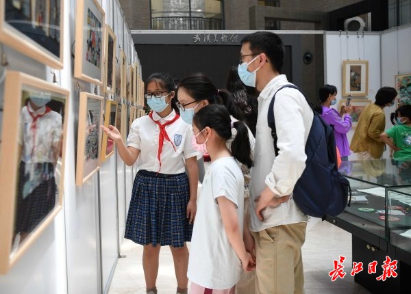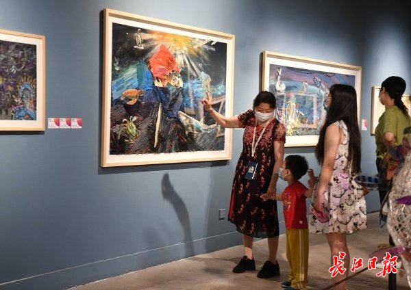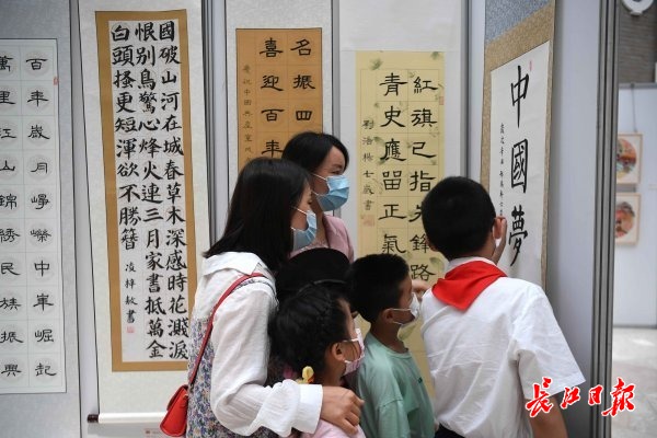 长江日报5月29日讯 “六一”前夕,武汉美术馆,第十二届萌芽杯少儿视觉艺术展和“花儿朝阳·童心向党”小学生美展同时开展。5月29日双休日,家长带孩子到美术馆一起观赏这些出自武汉少儿之手的作品,展览涵盖了少儿书法、绘画、陶艺、汉绣和装置艺术等,一些学生和家长饶有兴趣地边观赏作品,边展开讨论,沉浸在艺术的海洋里。 (长江日报记者高勇 摄影报道)