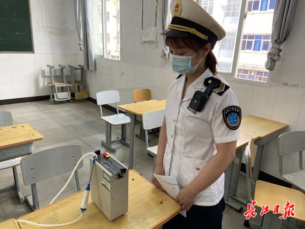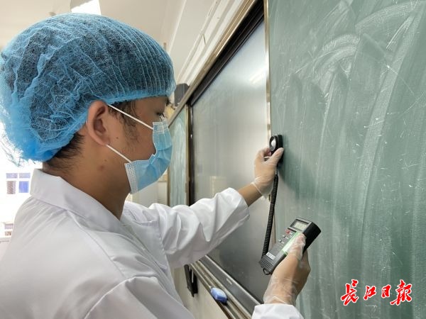 检查人员在检测教室的一氧化碳浓度。长江日报记者刘晨玮 摄