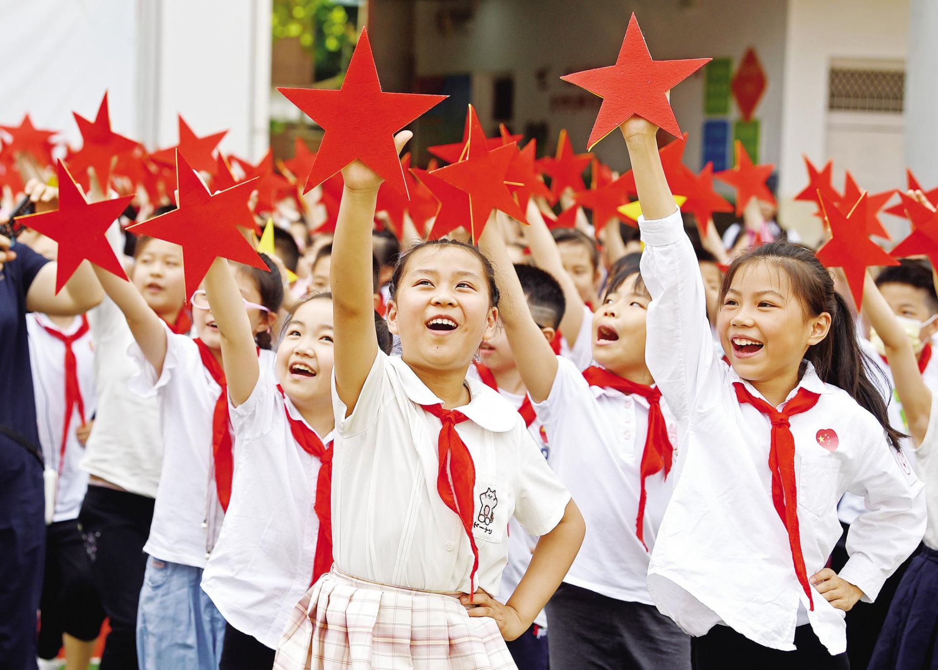 5月31日,武汉市江岸区黄陂路小学开展“红领巾心向党 唱红歌颂党恩”“六一”庆祝活动。1100余名师生以年级为单位开展红歌传唱,《祖国祖国我爱你》等一首首脍炙人口的红歌,一枚枚举起的红星,一面面挥舞的国旗,抒发了同学们对党、对祖国的热爱。