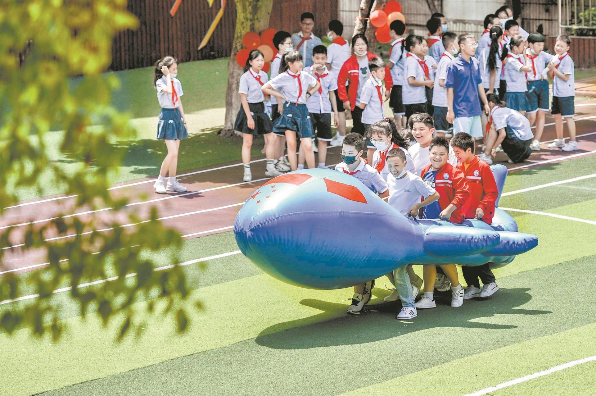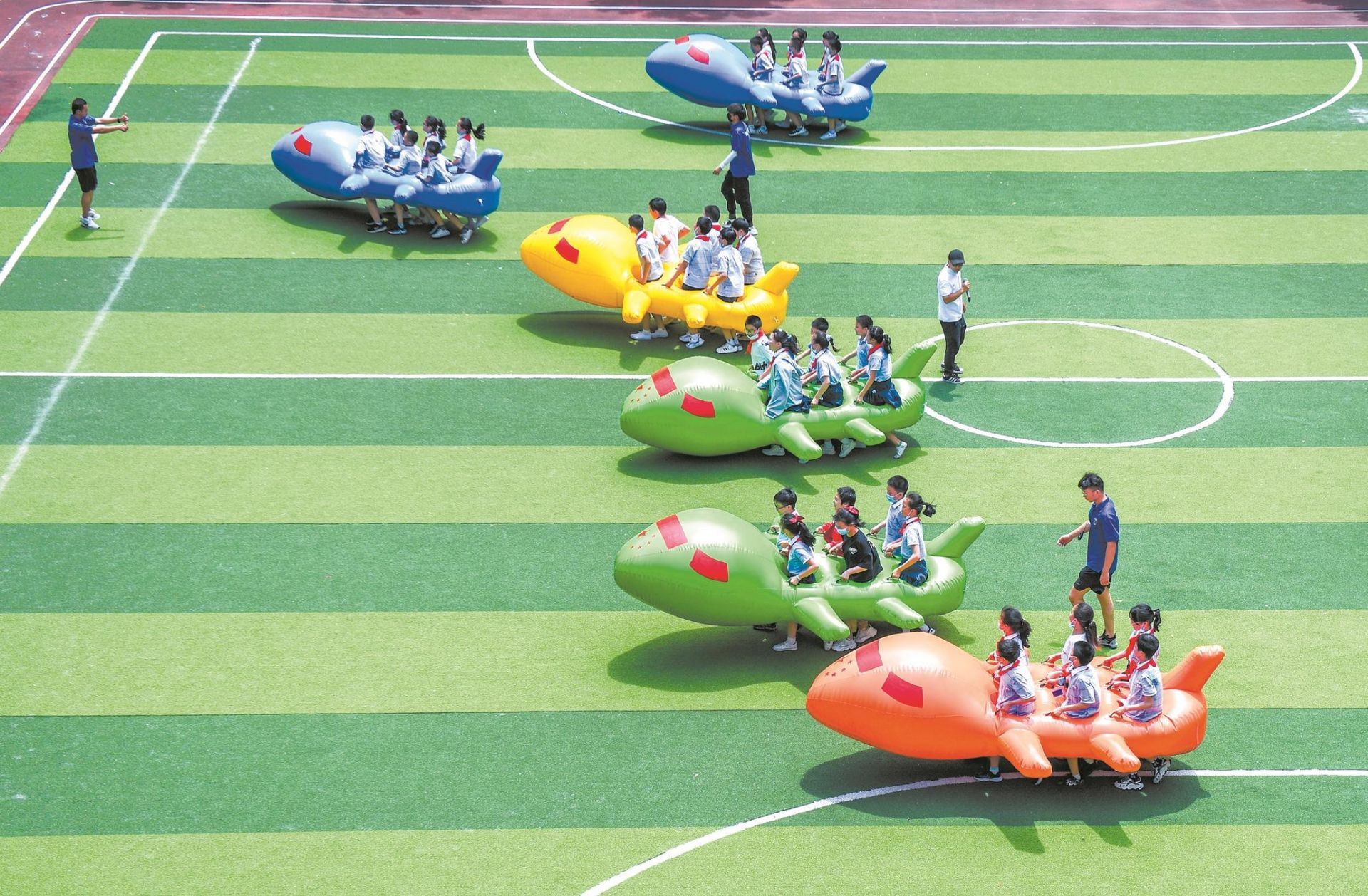 昨日,武汉市唐家墩小学1400多名师生欢聚学校操场,一起参加趣味运动会。学校负责人称,六一儿童节前夕,希望用游戏点亮孩子们的开心童年。 楚天都市报极目新闻记者黄士峰摄